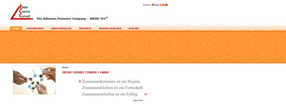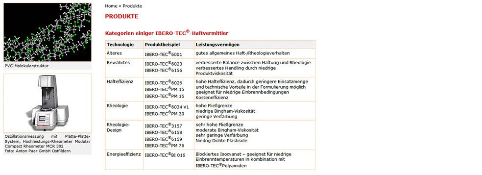Die IBERO CHEMIE CONSULT GmbH wurde im Jahr 2004 als hochspezialisiertes deutsches Unternehmen für “Haftvermittler” im Bereich der PVC-Plastisole gegründet. Dabei ist es das Anliegen, die Wertschöpfung der Kunden zu verbessern und natürlich aktuelle Aufgabenstellungen zur Zufriedenheit aller Beteiligten zu lösen.