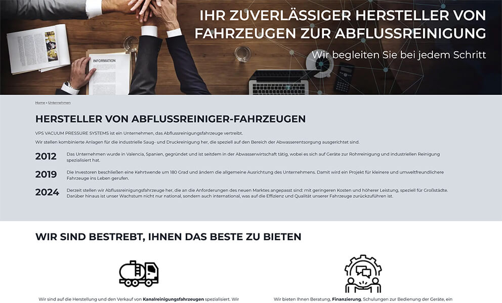 VPS Vacuum Pressure Systems ist ein spanisches Unternehmen, welches Hochdruckspül- und Saugfahrzeuge für die industrielle Reinigung durch Absaugen und Spülen herstellt. Die Fahrzeugpalette für die industrielle Reinigung umfasst Kanalreinigungswagen, Geräte für den Transport von Abwasser, Hochdruckreinigungswagen und vieles mehr.